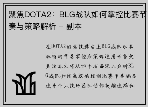 本文将对《英雄联盟》中IG战队的战术布局与技术创新进行深入分析。IG战队作为中国电子竞技的代表之一,以其灵活多变的战术和前沿的技术应用在赛场上屡创佳绩。文章将从四个方面详细探讨IG战队在比赛中的独特战略思维,包括其选手阵容的搭配、游戏节奏的把控、团队沟通与协调以及新兴技术的运用等。通过对这些方面的分...
