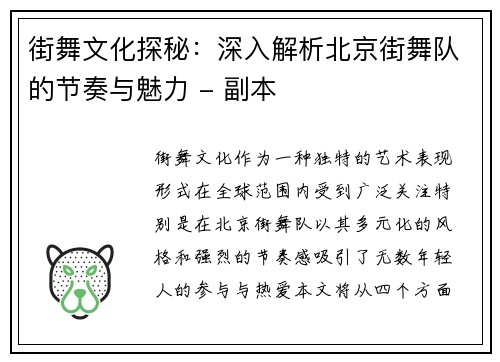 本文将深入分析北京羽毛球队所采用的包夹战术,探讨其在比赛中的优势及应用策略。首先,文章将对包夹战术的基本概念进行阐述,并明确该战术在羽毛球比赛中如何有效遏制对手的进攻。接着,将从提高防守效率、增强进攻威胁、促进团队配合和适应不同场地环境等四个方面详细分析包夹战术的优势与应用策略。通过具体案例和理论支...