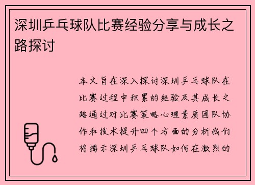 深圳乒乓球队比赛经验分享与成长之路探讨